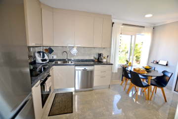 In einer kleinen, gepflegten Wohnanlage mit Palmengarten und Pool gelegen, öffnet sich hier ein Zuhause, das sofort Urlaubsgefühle weckt. Der geräumige Wohn- und Essbereich mit Kamin lädt zu gemütlichen Stunden ein und führt direkt hinaus auf die ca. 27 m² große, überdachte Terrasse. Von hier genießen Sie einen traumhaften Blick ins Grüne – morgens beim Kaffee, abends beim Glas Wein, begleitet vom Rauschen der Palmen. Die voll ausgestattete Küche mit praktischem Hauswirtschaftsraum bietet Platz und Funktionalität.